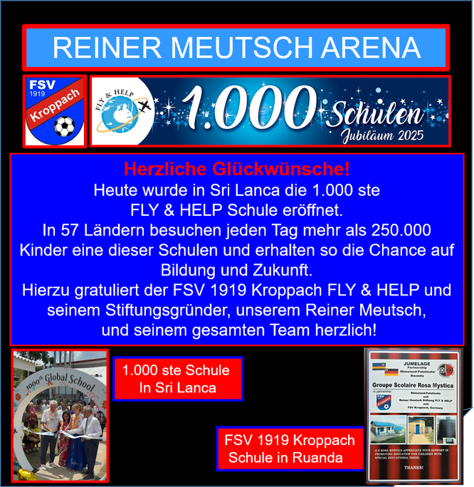 Am 13.05.2022 ab 16:15 Uhr wird der FSV Kroppach die Reiner Meutsch Arena offiziell mit einem großen Fest für den guten Zweck eröffnen. Mit dabei ist die Lotto-Elf mit vielen ehemaligen Fußball Bundesliga- und Nationalspielern sowie Schlagerstar Mickie Krause. Die offizielle Eröffnung der Sportplatzanlage wird im Rahmen einer in Kroppach einzigartigen Charity-Veranstaltung zugunsten von FLY & HELP durchgeführt. Sämtliche Eintrittsgelder und Spenden kommen der Stiftung an diesem Tag zu Gute. Viele Stars aus dem Sport und Entertainment werden dabei sein und unterstützen den FSV Kroppach und FLY & HELP bei dem Ziel eine weitere Schule in einem Land auf dieser schönen Welt bauen zu können und Kindern damit eine Zukunft zu geben.